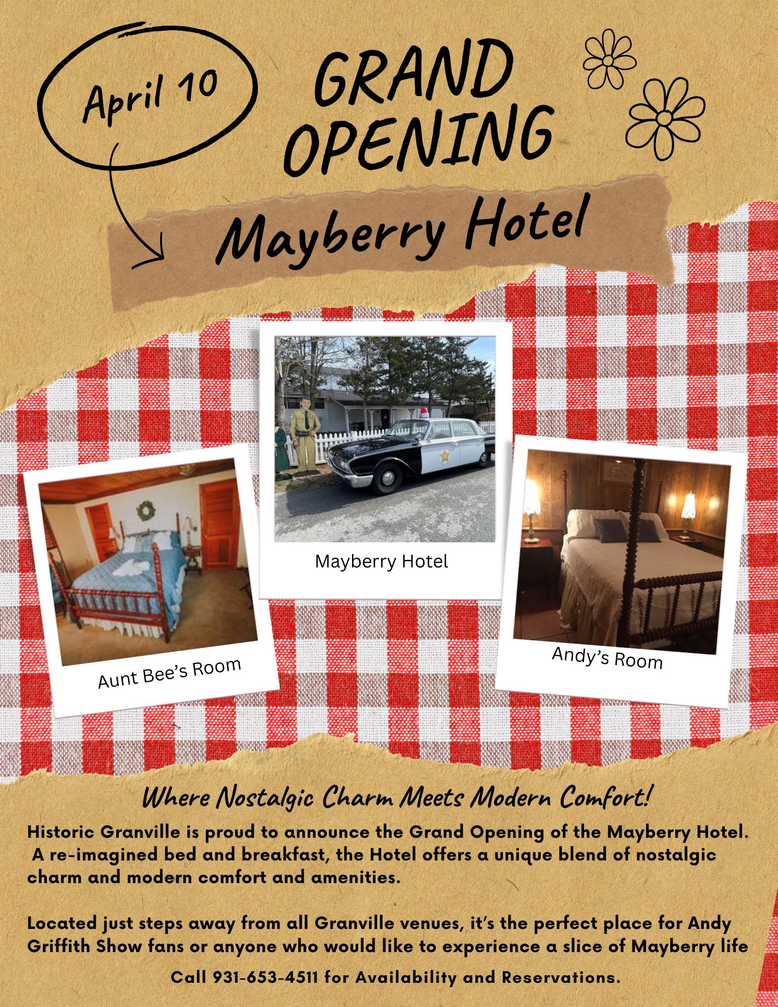 A trip to Historic Granville offers many rewards, including unmatched natural beauty of the hills and the lake. This Mayberry Town offers a full day agenda as a historic destination. You will be amazed by the 1880's award winning T.B. Sutton General Store, where you can browse historical artifacts, purchase handmade items, and enjoy delicious country cooking. The Granville Museum tells the story of Granville and surrounding area stores, churches, schools, and families. The Mayberry and I Love Lucy Museum showcases one of a kind, rare artifacts from these popular TV shows and Granville is proud to be the home of the "World's Largest" collection of limited-edition decanters at the Granville Whiskey Decanter Museum. The Southern Shops of Granville and Granville Gift Shop offer unique shopping opportunitues for our guests.